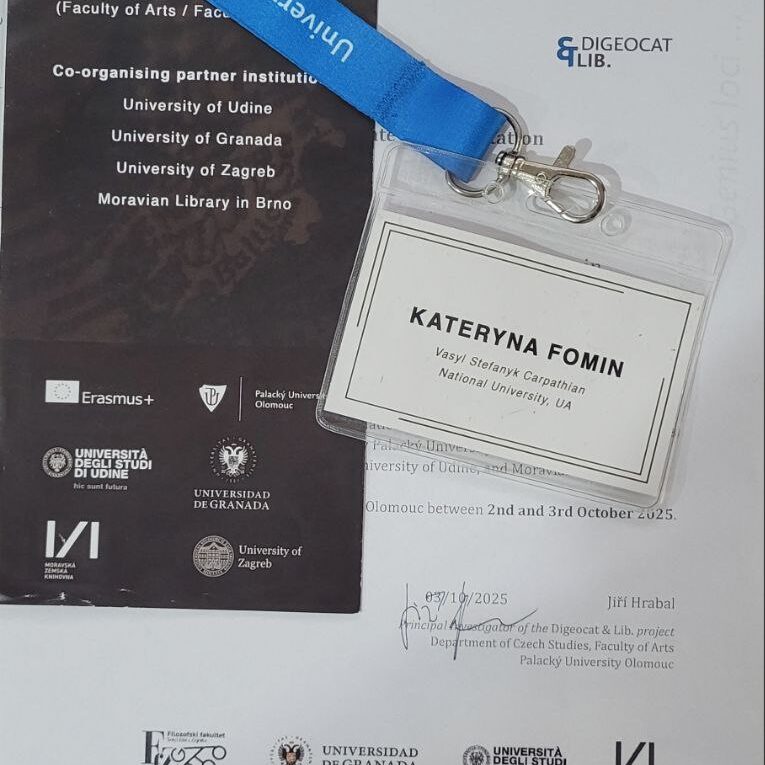 From October 2 to 3, 2025, Palacký University (Olomouc, Czech Republic) hosted the international scientific conference “Maps, Routes and Borders in Literary Culture”, organized within the framework of Erasmus+ partnership cooperation by the University of Granada (Spain), the University of Zagreb (Croatia), the University of Udine (Italy), Palacký University in Olomouc (Czech Republic), and the Moravian Library in Brno. The Center was represented by Kateryna Fomin, an expert in digital applications in teaching.